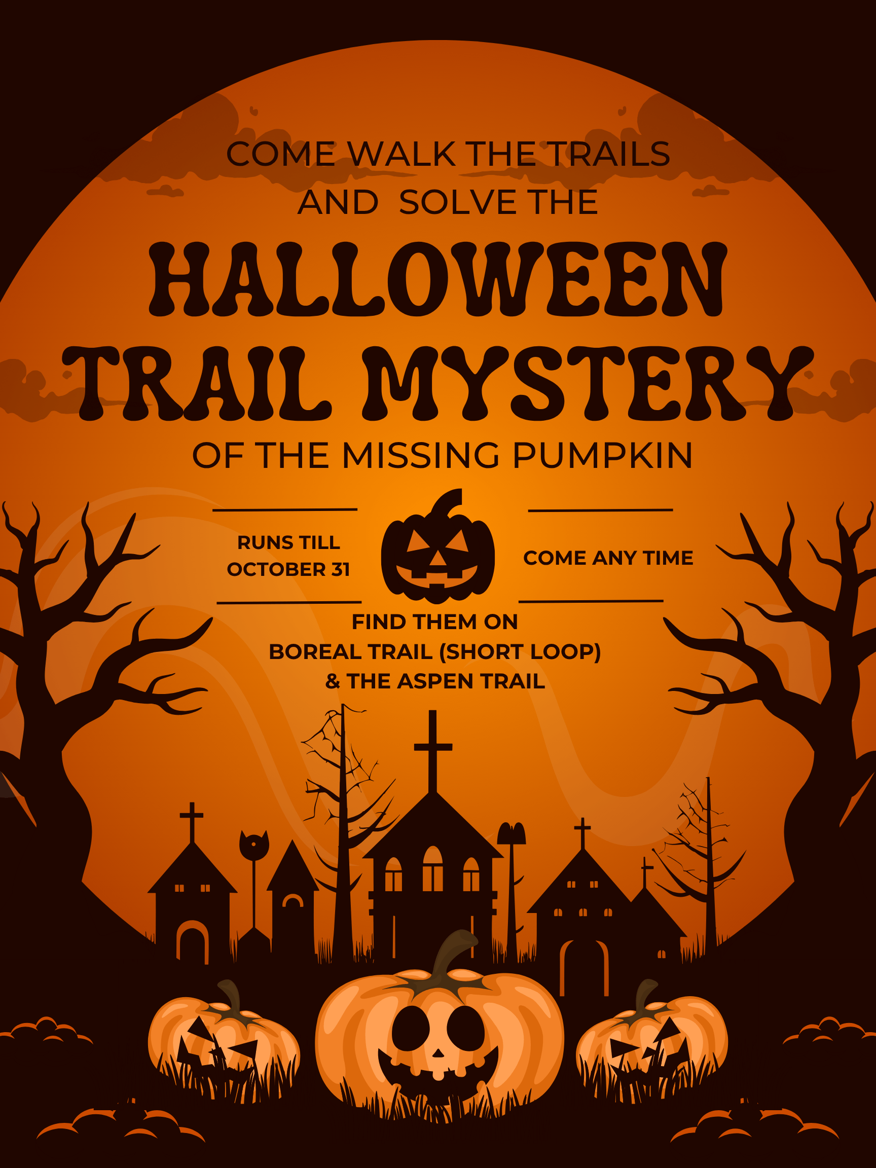 Something spooky (but not too spooky) is happening on the trail… Follow along for a fun story walk and help our furry forest friends solve the case of the missing pumpkin. There are 5 story stops to read; each will lead you closer to solving the mystery of the missing pumpkin.